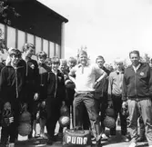 Striberg 18 november 1967 I en matsal vid gruvan i Striberg sitter personer vid fikabord och dricker kaffe och äter bullar.