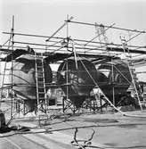 Gjutningsarbeten vid Diös-bygget i kvarteret Blocket i Sandviken, oktober 1953. Vid gjutningsarbetet användes bl.a. "Specialformluckan" tillverkad av plywood från fabriken i Ljusne.