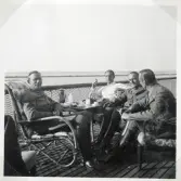 "Vila." Fyra officerare på balkongen till Malmö Yacht klubb, med utsikt över Öresund.