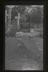 Ett okänt sällskap med vuxna och barn står utomhus runt en kista framför en gravsten.