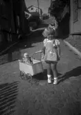 En liten flicka med dockvagn. Gittan Gustavsson med sin nya dockvagn. Bilden inscannad från Gittan Gustavssons fotoalbum. (Bilderna är tagna av William Geidne, Gittans pappa). Leksakerna på bilden (dockvagn, docka, dockkläder, solglasögon) överlämnades till museet, se föremål ÖLM 38701:1-12. Givaren fick dockvagnen och dockan när hon var 5 år gammal och lekte med dem i 7 år. Hennes mamma, Nanny Geidne (1910-1997) Örebro, sydde, virkade och stickade dockkläderna.