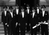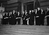 "Hedersdoktorerna under studentkårsuppvaktningen" på Universitetshuset trappa - professor Natan Lindqvist, direktor Yngve Rudberg, professor Nils Ahnlund, kontraktsprost Albert Nordberg, kyrkoherde Gustaf Ankar, professor G O Rosenqvist, domprost Gunnar Brundin, lektor Emilia Fogelklou Norlind, professor Fredrik Paasche och professor H S Nyberg