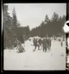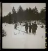 Älgjakt. Jägare med hundar bredvid jakttroféer: älghuvud och klövar. Bodums socken, Ångermanland.