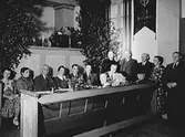 Kållereds församlingshem, Svenska kyrkan okänt årtal. Luciafirande - kyrkliga samfällighetens personalmöte. Från vänster: 1. Lucia, 2. Eva Carlsson, 3. Okänd, 4. Okänd, 5. Anders Bohlin, diakon i Kållered.
