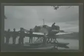 Förberedelse för upptagning av flygplan TP 24 på slip. Flygplanet förtöjes. I bakgrunden syns flygplan T 2.