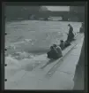Tre män tittar i en fotografi-portfolio.