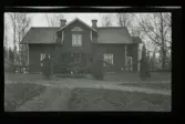 Ett tvåvåningshus med locklistpanel, farstun pyntad med girlanger. Två kvinnor står innanför ett vågigt spjälstaket.