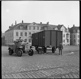 "Växeltraktor" tillhörande Svenska Sockerfabriks Aktiebolag, SSA samt sluten godsvagn Statens Järnvägar, SJ G3 på en vagnvändskiva.