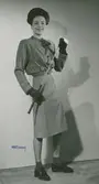 "Nytt och nyttig, kjolen är betydelsefull" Modell i kjol och jacka, handskar och snörskor, med golfklubba i handen. Från Grieder.