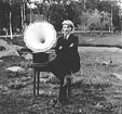 Herbert Johansson Örbytorp V-Kleva. Han var dräng hos Anna Persson i Ögården. Grammonfonen hade Annas man Gustav köpt på auktion i Änga. Fotot taget i Ögården.