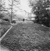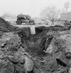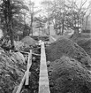 Dokumentation av "Sverige bygger" utställningen. Träbyggnad t h och grunden på Surbrunnsgatan 11 t v. och Östermalmshallen rakt fram.