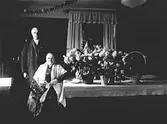 Ett äldre par, Dalenborg, som troligen firar guldbröllop eller någons födelsedag, med sina barn och gratulationsblomster omkring sig.