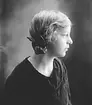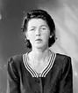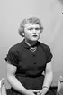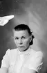 Frisyrvisning, Wessels skyltar 27 september 1967 Kvinna sitter modell för en frisyr. I bakgrunden ser man en stormönstrad tapet och ett fönster med gardin.