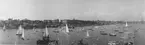 'Haj uppdragen på båtdäck. En man håller i en kedja som sitter fast i ett rep som virats kring hajen. Ett tiotal män tittar på, varav 2 iklädda keps. :: :: Ingår i serie med fotonr. 6928:1-6.'