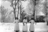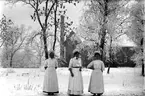 När familjen Brundin bodde på Söder i Gävle, Södra Centralgatan 26, var det inte långt till södra koloniområdet och familjen gjorde ofta utflykter dit. Eva Brundin längst fram, bakom henne Sören Brundin och kvinnan till vänster var hembiträdet eller hushållerskan Ester, som var från Freluga i Hälsingland. Foto ca 1928.