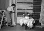 "Skåneflickorna lägga sista handen vid sin avdelning" på Sveriges lantbruksuniversitets hemslöjdsutställning i Uppsala Studenkårs lokaler på Riddartorget 5