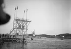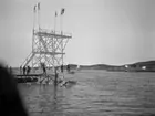 Evedal, 1943. Uppvisning från hopptornet. En ung man har just kastat sig ut, beundrad av publiken.