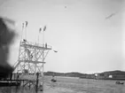 Evedal, 1943. Uppvisning från hopptornet. En ung man har just ställt sig på händer, beundrad av publiken.