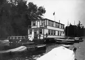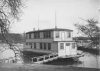 Bäckmyrviken. Motorbåten och radiostyrda båten, med husbåt, med bakläns mellan sig.