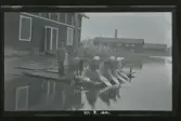 Klädvård. Tvättning av kläder utomhus på Hallagård. Kvinnorna som tvättar är fr v Ebba Larsson, Alice Andersson och Ebba Stener. Se E7136, foto från samma tillfälle.
