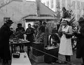 Lottor serverar soppa från kokvagn i samband med Fackskolan för hushållsekonomis hushållskurs om matlagning i kristid, Trädgårdsgatan 14