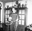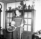 Säfwenbergs Boll- och klubbfabrik i mars 1938, vid Uppsala-Gävle Järnvägs f.d. lokstall som idag tillhör Järnvägsmuseets område på Rälsgatan 1 i Gävle. Sven "Sleven" Säfwenberg, bandyspelare.