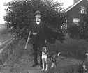 EN JÄGARE STÅR PÅ EN MINDRE VÄG, I ENA HANDEN HÅLLER HAN ETT GEVÄR OCH I DEN ANDRA EN SKJUTEN FÅGEL. FRAMFÖR HONOM STÅR EN JAKTHUND, STÖVARE.