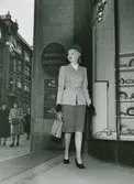 "Fru Millan köper julklappar." Klädd i dräkt, hatt, pumps och handväska, utanför Nordiska Kompaniet. Pristävling-B.M.T:s nya.