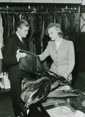 "Fru Millan köper julklappar." Klädd i dräkt och basker, expedieras av man i kostym på Nordiska Kompaniet.