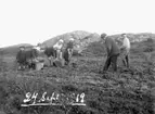 "Potatisupptagning. Från vänster: Gösta - Lisa - okänd - Kroke Lena - Anna Bohlin - Klara - Johannes A. - Joel Krok. 24 september 1919."