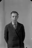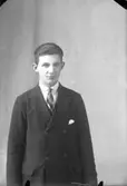 Andersson Gustavsson mode 23 april 1966 En manlig fotomodell visar kläder. Han är klädd i vit ytterrock, mörk skjorta, slips, byxor, skor och hatt. I bakgrunden syns ett omklädesrum med draperi framför. Kavajer hänger på galgar på en ställning.