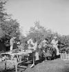 Skara. Stadsträdgården. Konservator Beda Westmans 50-årsdag firas på museet. Foto: Ivar Söderqvist 26/4 1944. Styrelsen för Fornminnesföreningens arbetsutskott, utskottets tidigare ordförande Rektor Welin, fornminnesföreningens vaktmästare och dess konservator, Fru Westman, samlade å museét i Skara för firande af den sistnämndas 50-års dag. Sittande från vänster: Kassör Hjortén, Adjunkt Carlsson, Landsantikvarie Ullenius, Ryttmästare Ekberg, Fru Westman, Rektor Welin. Stående: Vaktmästare Johansson.