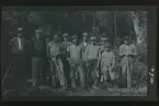 Gruppbild vid granplantering hos August Snygg. Mannen i hatt heter Einar Klasson. I förgrunden står hinken med granplantorna.