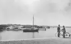 Vy från akterdäck mot fartyget Blenda till sjöss. I bakgrunden syns kobbar och skär.