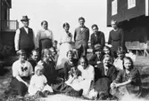 "En tidig morgonstund 1923." Boningshus till vänster och kvarnen till höger. Släkt och vänner är samlade hos värdparet Sven-Petter och Josefina Andersson (längst upp till vänster).
