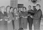 Kyrkokören på besök i Brattåshemmet år 1969. Från vänster: kantor Bengt Forsberg, föreståndare Magda Andreasson (i folkdräkt) som serverar kaffe, Karl Olofsson och Ingrid Skansing. Med ryggen mot kameran: Gunvor Eriksson samt okänd. I bakgrunden ses bl a Blomberg
