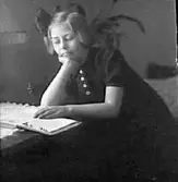 Rosa Pettersson hjälper dotter Eva (gift Kempe) att läsa läxan, Gamlehagsvägen 17 i Torrekulla, år 1952.