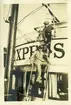En matros i blöta kläder efter utfört klädsim hälsar på man vänd med ryggen mot fotografen. Bakom de står en lejdare (stege).