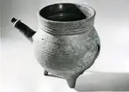 "Info från fotobeskrivning" "Glaserat kokkärl i lergods defekt."