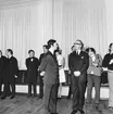 Synskadade kvinnor i nationaldräkter dansar vid De Blindas dags stora varumässa i Blå hallen i Stadshuset den 15 oktober 1950.