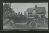 "Hvilsta, droskägare John Andersson med syster Ebba och föräldrar." Ett sällskap sitter i en bil, på vägen framför ett hus.