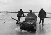Posten lastas av i Arjeplog, 1952. Bussförare Nilsson till höger och till vänster brevbärare Mauritz Hellander, Arjeplog.