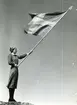 Byst av Hjalmar Branting med fanor och emblem i samband med Sveriges socialdemokratiska arbetarepartis 50 års jubileum.