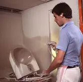 Interiör, Sanitetsporslinsfabriken. Sprutglasering i sprutskåp av sanitetsgods. Personer: okänd