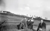 "Plantskolan i Barnabro, Lindberg, omkring 1940. Stormhall i bakgrunden." Två män och två kvinnor sitter på huk ute på fälten. Fotografen flyttade till Barnabro 1938.