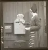 Operatör vid manuellt växelbord i telestationslokal på Dalarö. De många överbryggsutrusningarna är på grund av att de även kopplade rikssamtal till Stockholm.