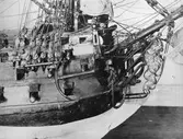 En skadad besättningsman förs över från pansarskeppet Gustaf V till lasarettsfartyget Prins Carl.