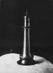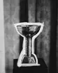 MD-mästerskap i båtrodd. FISS styrare hämtar priset av amiralen. Konteramiral Samuelson (till höger), klädd i uniform, överlämnar en pokal till en yngre man. Bakom den unge mannen står ytterligare en man som betraktar händelsen. I bakgrunden syns Stumholmen med fyren Karlskrona nedre.