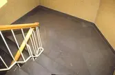 En rock hänger på ett räcke. Interiörfotografi från byggnad vid Soabs industrianläggning i Mölndals Kvarnby, år 2007. Anläggningen användes vid fototillfället av Hexion Speciality Chemicals Sweden AB.