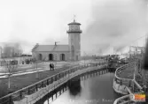 "Spruthuset och Kanalbron" i Ljusne I bakgrunden syns brandröken av den förödande storbranden i brädgården 1893. Ett helt årslager av utskeppningsfärdigt virke gick upp i rök. På bilden syns en del av kanalen som försåg Norra järnverket med vatten.
